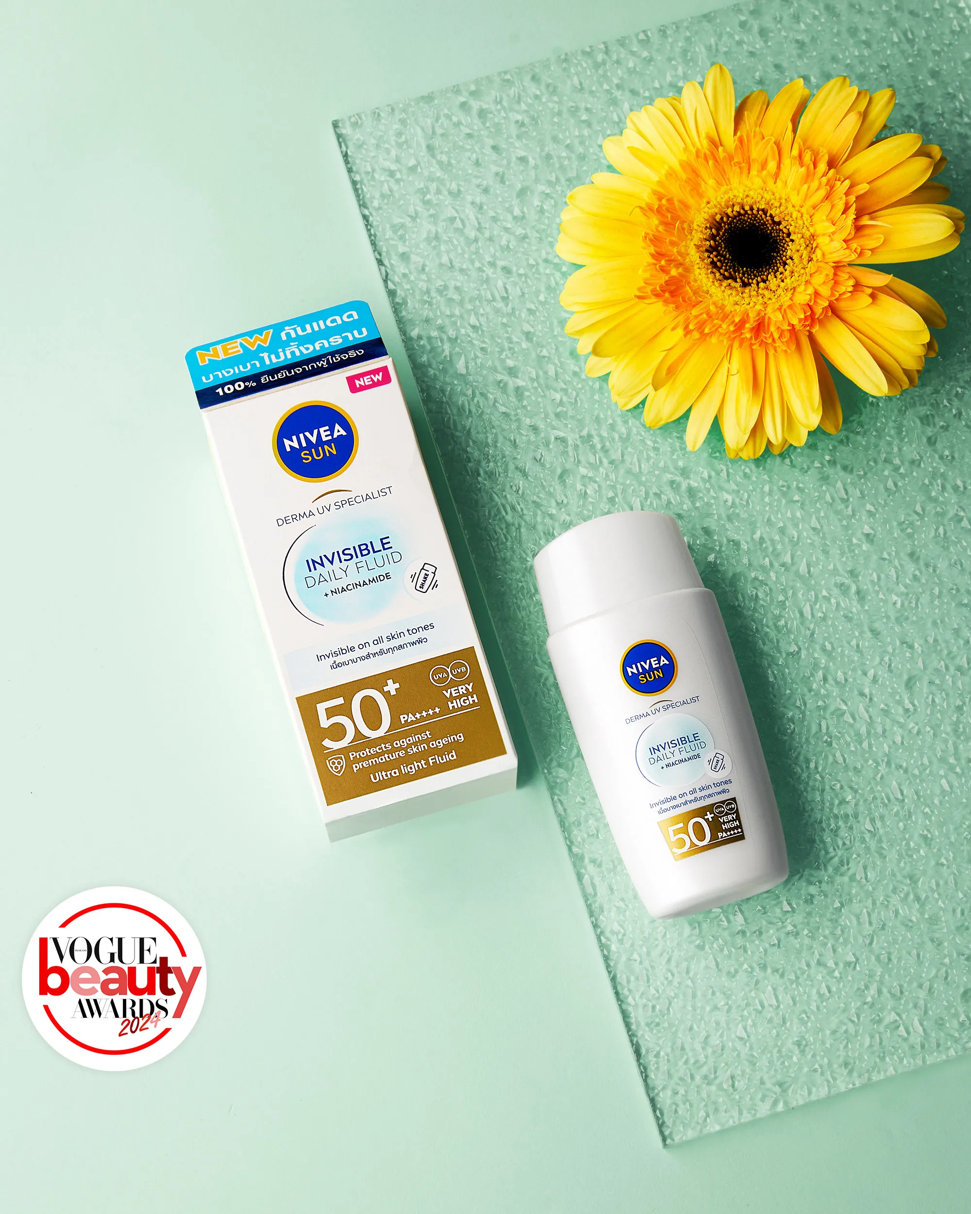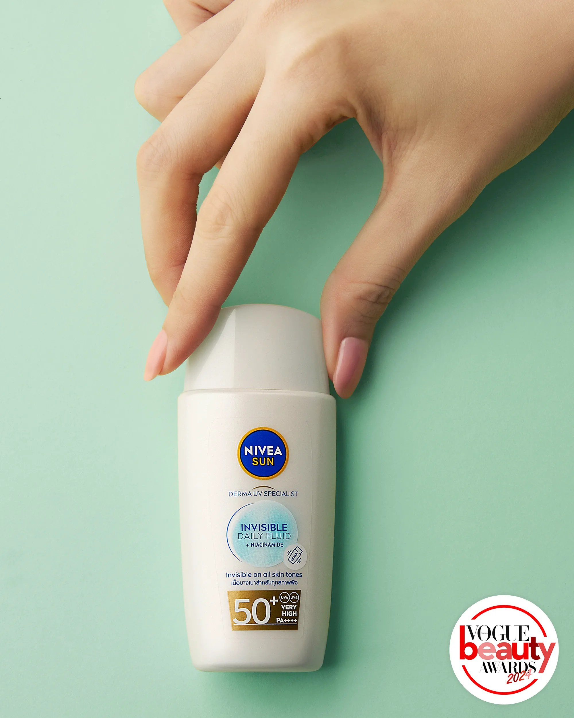 Invisible Daily Fluid SPF50+ PA++++ จาก NIVEA SUN กันแดดเวชสำอางสำหรับผิวหน้า สูตรอ่อนโยนต่อผิวและไม่ทำให้เกิดการระคายเคืองรอบดวงตาซึ่งผ่านการทดสอบจากแพทย์ผู้เชี่ยวชาญด้านผิวหนังและจักษุแพทย์ หนึ่งตัวสูตรแรกที่ช่วยตอบโจทย์ในการปกป้องผิวหน้าจากรังสี UV ได้อย่างยาวนานถึง 8 ชม.* ตั้งแต่หลังทาให้ความรู้สึกเบาผิวเหมาะกับในชีวิตประจำวัน ซึ่งผสานส่วนผสมสำคัญอย่าง Licochalcone A, Niacinamide, วิตามิน E ที่ช่วยลดปัญหาผิวแห้ง ผิวหมองคล้ำหลังเผชิญกับแสงแดด พร้อมบูสต์ผิวให้แข็งแรงยิ่งขึ้น อีกทั้งยังมีส่วนผสมพิเศษ Antioxidans ที่เป็นส่วนผสมหลักเฉพาะจากนีเวีย ที่สำคัญคือครีมกันแดดตัวนี้มีเนื้อฟลูอิด มาพร้อมเนื้อสัมผัสที่บางเบา ซึมซาบเร็ว ไม่เหนียวเหนอะหนะ สามารถทาทับเมกอัปได้เลยไม่ทำให้หน้าขาวลอยและเป็นขุยอีกด้วย
