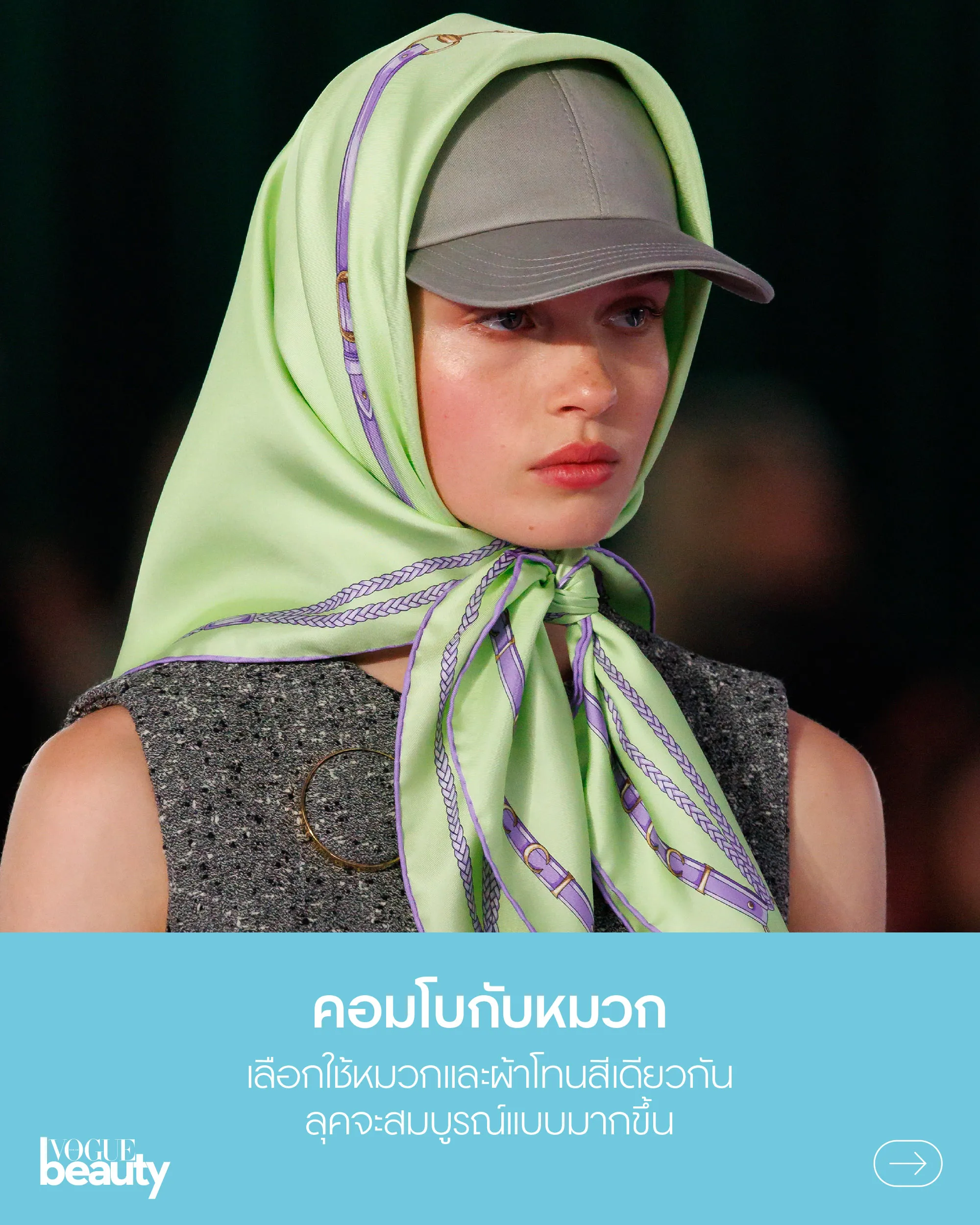 อีกหนึ่งสไตล์ยอดฮิตคือการใส่หมวกก่อนแล้วคาดทับด้วยผ้าโพกศีรษะ ควรเลือกใช้หมวกและผ้าโทนสีเดียวกัน ลุคจะสมบูรณ์แบบมากขึ้น เป็นอีกลุคที่เหมาะกับวันสบายๆ ที่ไม่อยากทำผมให้ยุ่งยาก แล้วยังเหมาะกับสไตล์การแต่งตัวไปเที่ยวทะเลอีกด้วย
