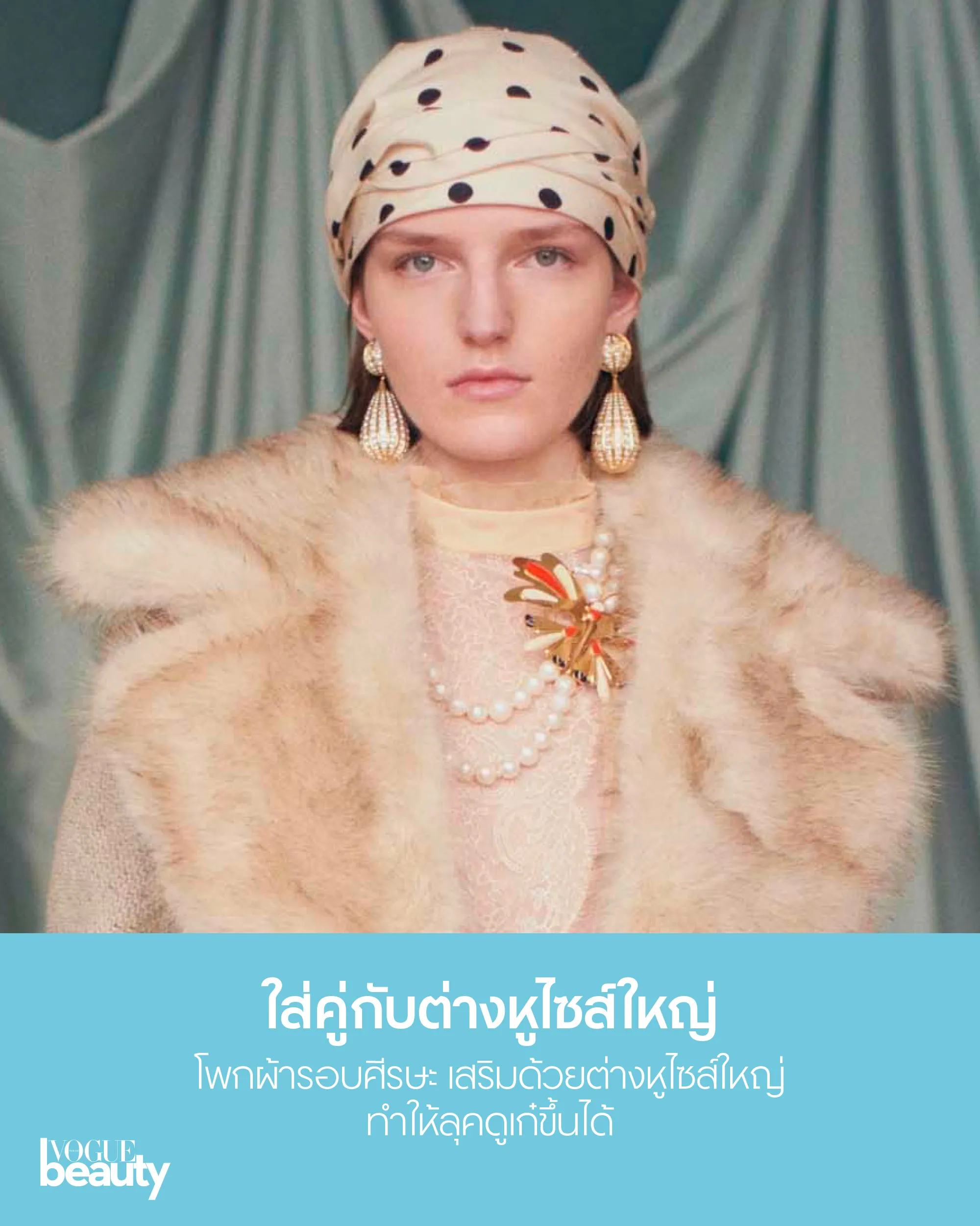 สไตล์การโพกผ้าแบบนี้ต้องใช้สไตล์การโพกผ้าแบบเปิดช่วงหู หลังจากโพกผ้ารอบศีรษะแล้ว ให้ลองเสริมด้วยต่างหูไซส์ใหญ่ยิ่งทำให้ลุคดูสวยแพงขึ้นได้ นิยมเป็นต่างหูแบบห่วง หรือต่างหูแบบกลมๆ สีทอง ก็ยิ่งทำให้ดูโดดเด่นขึ้นกว่าเดิม