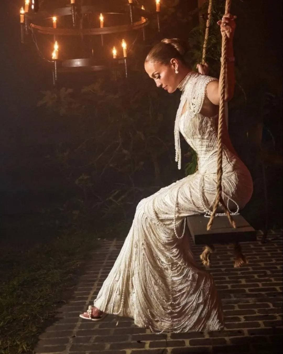 ภาพถ่าย Jennifer Lopez และชุดเจ้าสาวคอเต่าเย็บระบายสีขาว ที่มาพร้อมกับรายละเอียดงานตัดเย็บชิ้นผ้ากว่าพันชิ้นให้เป็นซิลูเอตแบบหางปลาในช่วงชายกระโปรง สะท้อนกลิ่นอายความคลาสสิก