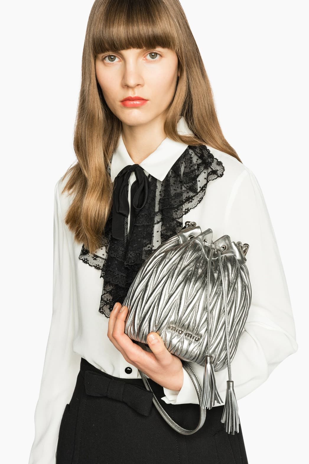 กระเป๋าทรงถังสีเงินวาววับจากแบรนด์ MIU MIU นอกจากจะโดดเด่นด้วยสีสัน รูปทรงก็ยังมีเอกลักษณ์และลวดลายอันประณีตที่ไม่มีใครเหมือน ตัวด้านในกระเป๋าซับในด้วยผ้าคอตตอนซาติน มาพร้อมสายรูดปิดกระเป๋าที่ปลายเชือกมีดีเทลเป็นพู่สวยงาม สายสะพายหนังสามารถปรับความยาวได้ และยังสามารถถอดออกได้หากต้องการปรับเปลี่ยนมาใช้ในรูปแบบกระเป๋าถือ