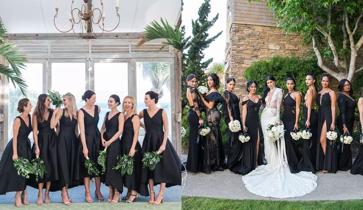 สำหรับชุดเพื่อนเจ้าสาวสีดำนั้นต้องขอยอมรับว่าเจ้าสาวมีความกล้าหาญที่ตัดสินใจใช้สีดำในงานวิวาห์ของตัวเอง แต่โดยความคิดเห็นส่วนตัวคิดว่าหลายงานที่ใช้ธีมชุดเพื่อนเจ้าสาวสีดำคือต้องการให้ภาพออกมาสวยและคลาสสิก ขับให้ชุดเจ้าสาวสีขาวดูสวยสง่า อีกนัยหนึ่งที่เคยได้รับฟังมาคือทำไมสูทของผู้ชายเป็นสีดำในงานแต่งงานได้ แต่ผู้หญิงแทบจะไม่สามารถใส่ชุดสีดำมางานแต่งงานได้เลย แต่เราก็ได้พบในภาพยนตร์ Sex and the City ฉบับ The Movie ภาค 1 ในงานแต่งงานของแครี่ เพื่อนเจ้าสาวอย่างชาล็อตยอร์กได้เลือกชุดราตรีหางปลาที่แสนสวยสีดำที่เดินแสนลำบากมาเป็นชุดร่วมแสดงความยินดีในงานสำคัญของเพื่อนสาวคนสนิท