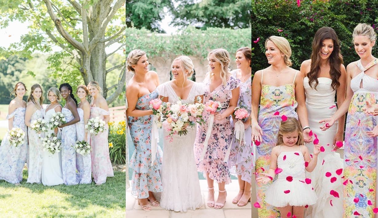 ลายดอกไม้แสนหวานบ่งบอกถึงความสดชื่นและขีดสุดของความสุข ซึ่งดอกไม้สื่อถึงความหมายมากมาย แต่ส่วนมากนั้นจะหมายถึงความยินดีและความสุขสมหวัง ชุดเพื่อนเจ้าสาวลายดอกไม้จึงเป็นไอเดียที่แฝงด้วยความหมายที่ดี อีกทั้งยังสวยงามผสานความหวานๆ เบ่งบานพลีความเฟมินีนได้อย่างเต็มที่ เพื่อนเจ้าสาวจะทำหน้าที่เสมือนเป็นทุ่งดอกไม้เคลื่อนที่ให้กับเจ้าสาว ซึ่งมู้ดแอนด์โทนในรูปที่ได้คือความอ่อนหวาน และความละมุนอย่างพอดิบพอดี ชุดลายดอกไม้มักจะมากับผ้าที่ทิ้งตัว พลิ้วไหว และให้ความรู้สึกสบายๆ สร้างบรรยากาศที่ตลบอบอวลไปด้วยความรักอย่างงานวิวาห์ได้ดี เจ้าสาวที่อยากให้งานของตัวเต็มไปด้วยความอบอุ่น หอมกรุ่มความรักและความหวาน ก็อย่าลืมพิจารณาชุดเพื่อนเจ้าสาวในธีมฟลอรัล รับรองไม่ผิดหวัง