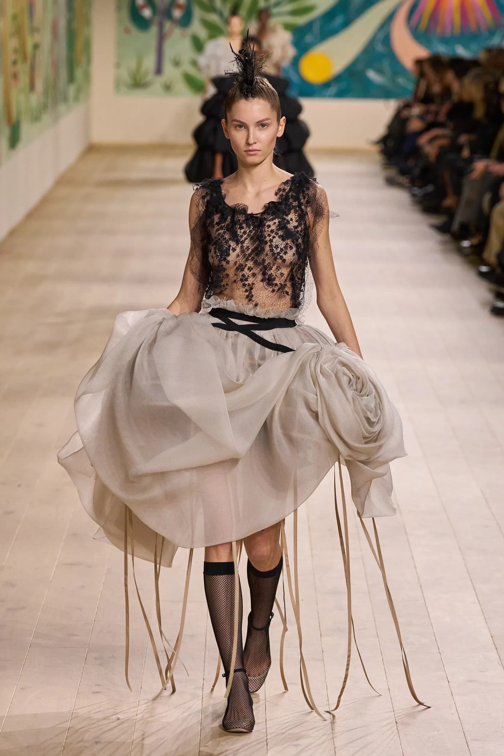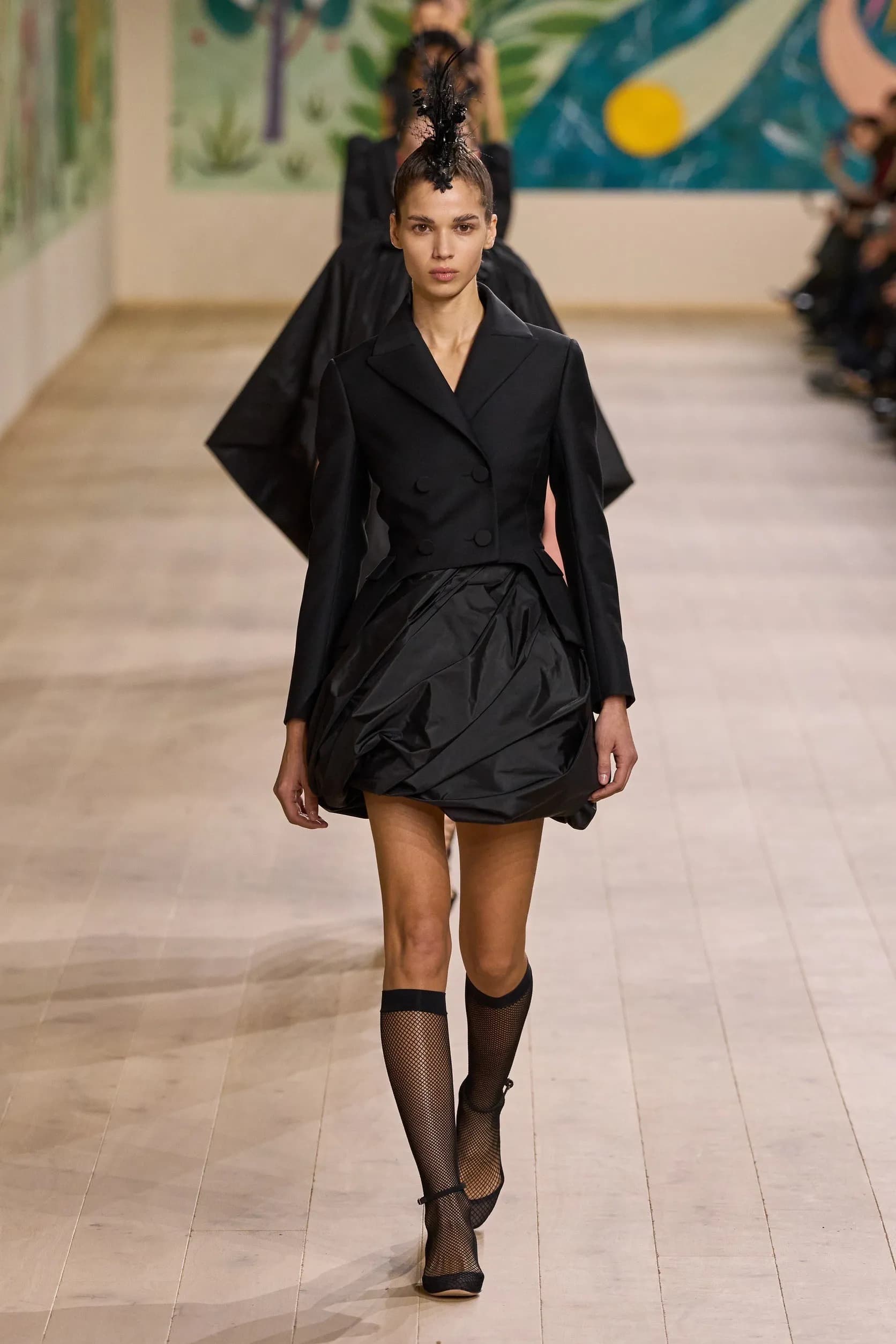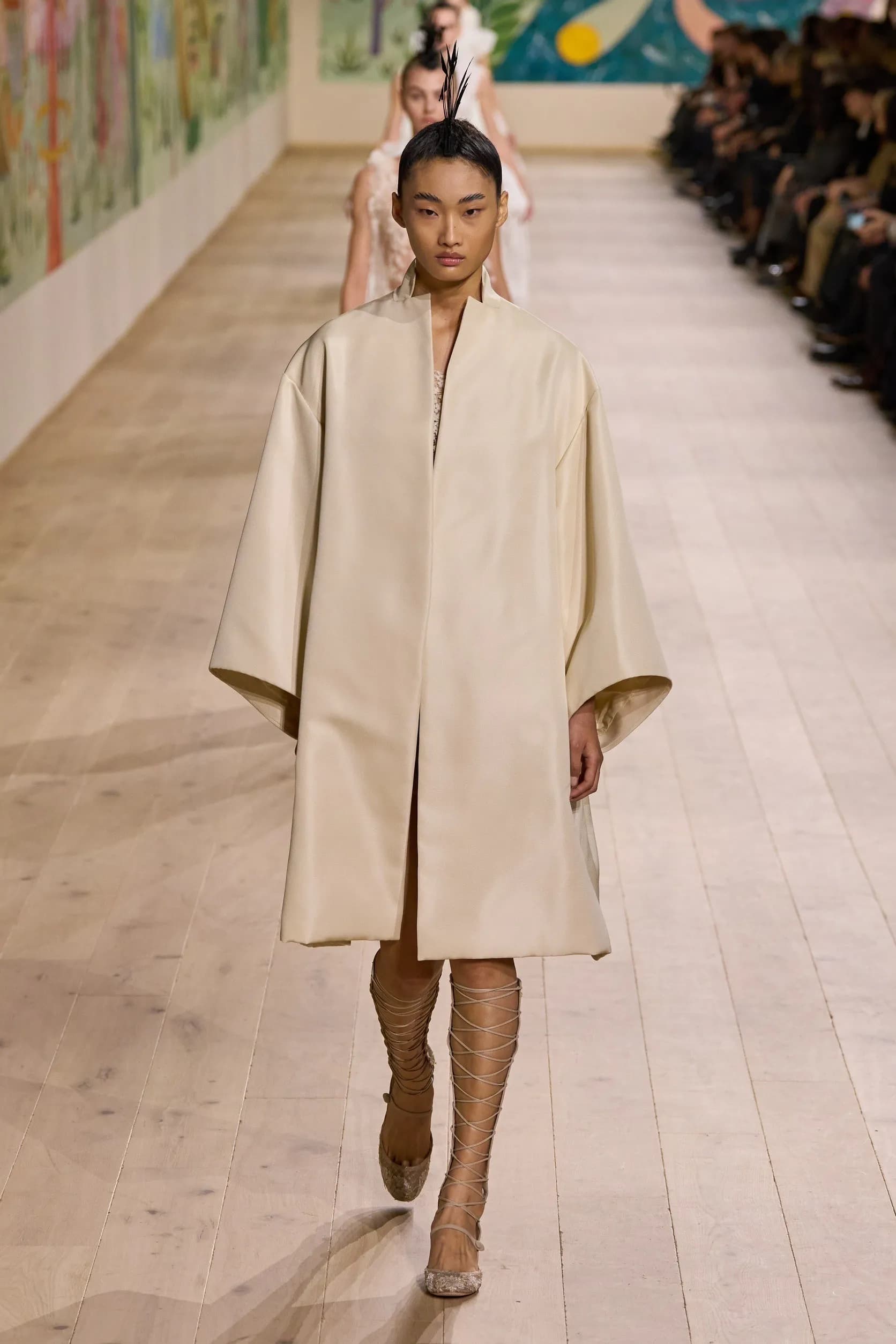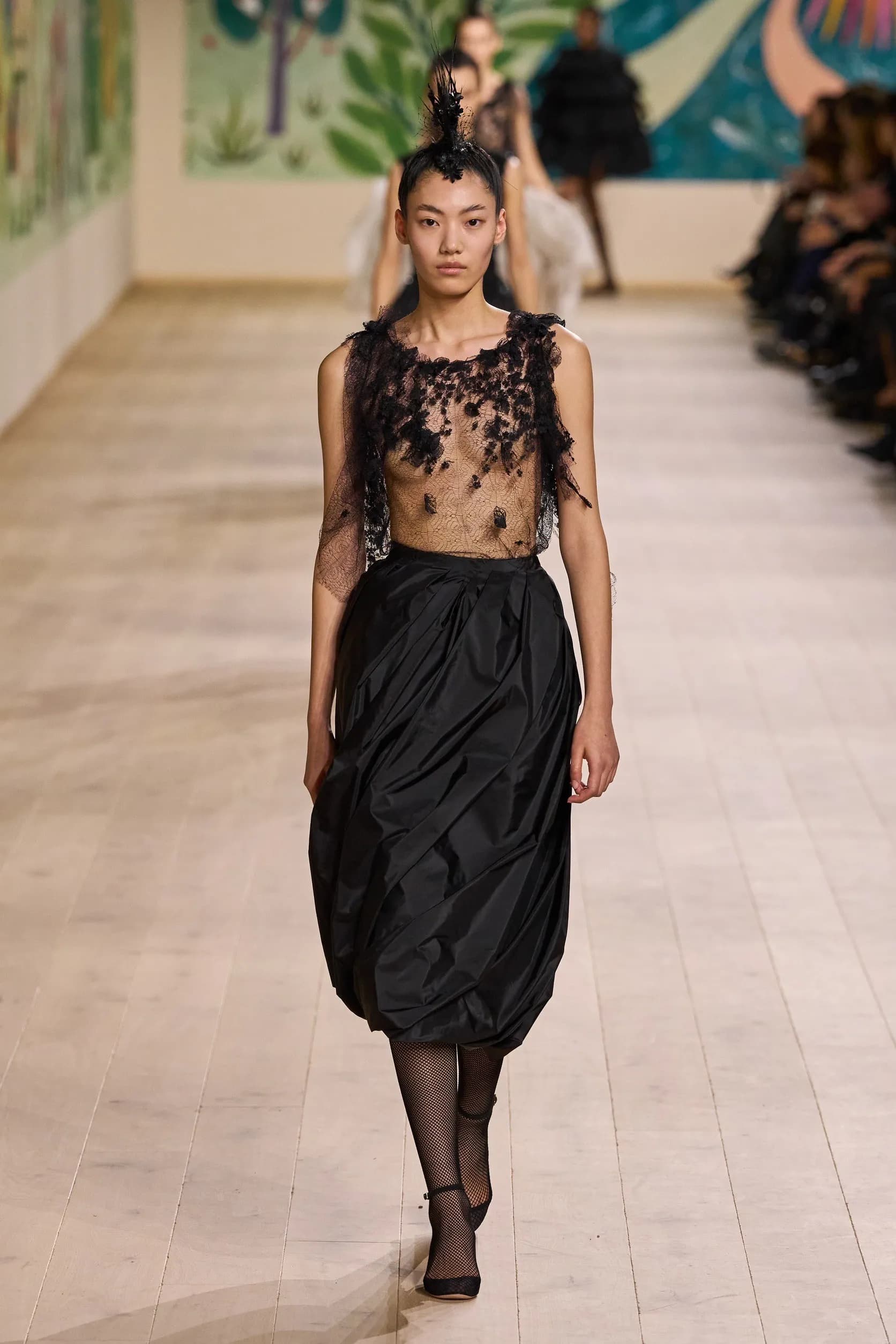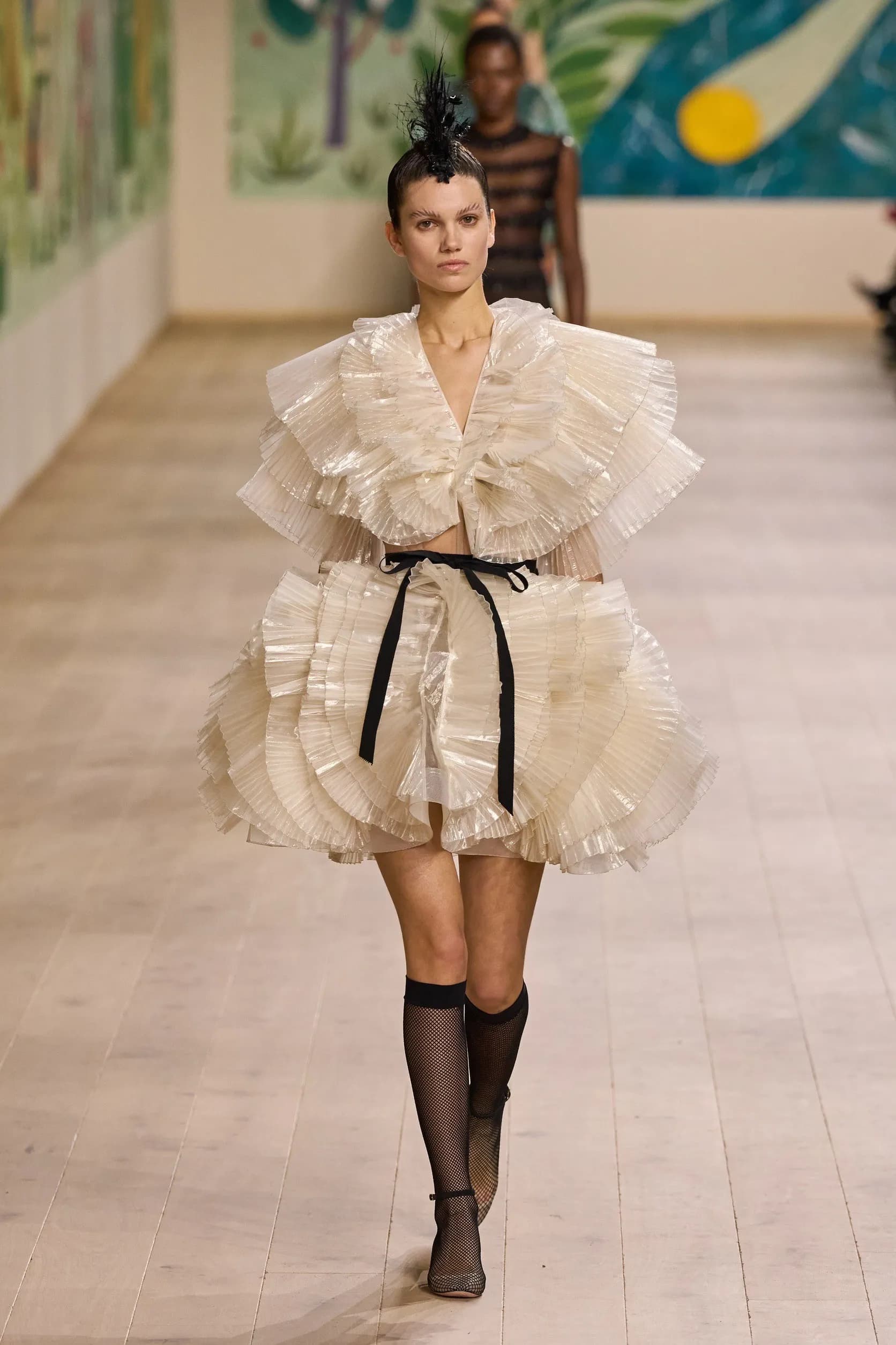 Trepèze Line กลายมาเป็นหัวใจหลักสำคัญ Dior ของคอลเล็กชั่นโอตกูตูร์ ฤดูใบไม้ผลิ/ฤดูร้อน 2025 พร้อมย้อนอดีตสู่ความเกรีียงไกรในยุคสมัยการกุมบังเหียนของ Yves Saint Laurent เมื่อช่วงปลายทศวรรษ 1950s ดูเหมือนว่า Maria Grazia Chiuri จะปรับโฉมรูปแบบของซิลูเอตให้เข้ากับยุคสมัยผ่านการเปลี่ยนแปลงสู่แพตเทิร์นเสื้อผ้าเด็ก โดดเด่นด้วยงานโครงสร้างชุดที่ถูกเปิดเปลือยให้เห็นชัดเจน เรื่อยไปจนถึงงานปักประดับฟลอรัลและลูกไม้พลิ้วไหว ที่ยังคงสะท้อนกลิ่นอายแบบเฟมินีนที่มาเรียถนัด นอกจากนี้การแบ่งสัดส่วน การครอป หรือแม้กระทั่งระดับความยาวของชุดยังเป็นไฮไลต์เด่นที่สะท้อนภาพความงดงามของผลงานตัดเย็บชั้นสูงครั้งนี้ ตัดกับเครื่องประดับศีรษะที่ให้กลิ่นอายความพังก์ผสมผสานความเนี้ยบสไตล์ซาร์ทอเรียล แนวทางแฟชั่น 2 รูปแบบที่สวนทางแต่บรรจบกัน ณ โชว์ครั้งนี้พอดิบพอดี คริโนลีน กระโปรงสุ่ม และกลิ่นอายของชุดสำหรับสตรียุคเก่าถูกรื้อสร้างใหม่ นำเสนอพร้อมกับผลงานการรังสรรค์ชิ้นไอคอนิกของ Christian Dior อย่างบาร์แจ็กเก็ต นอกจากนี้ยังมีมินิเดรสตัวจิ๋วที่สะท้อนภาพความงดงามของเมซงในการผลัดเปลี่ยนยุคสมัยได้เป็นอย่างดี ติดตามชมลุคทั้งหมดของโชว์นี้ได้ที่ด้านล่าง