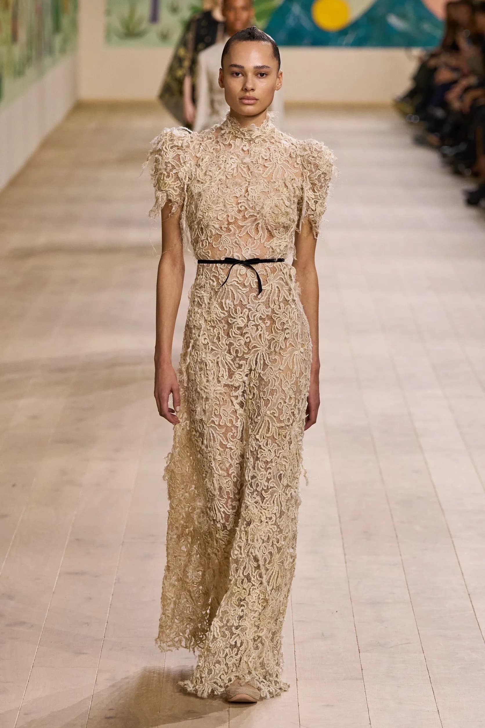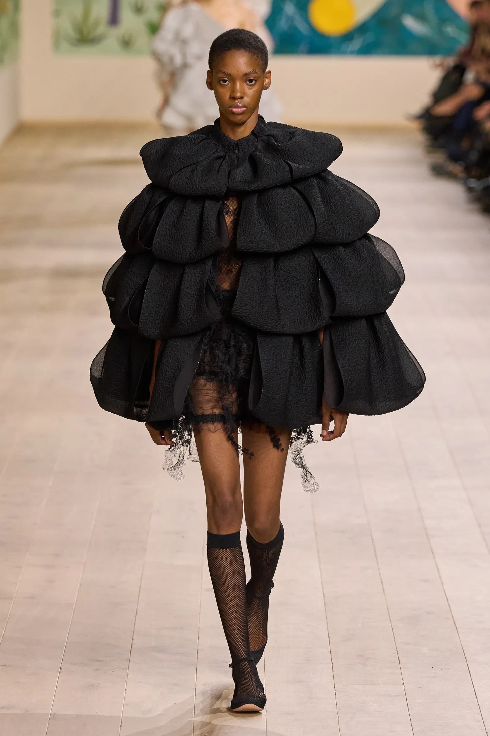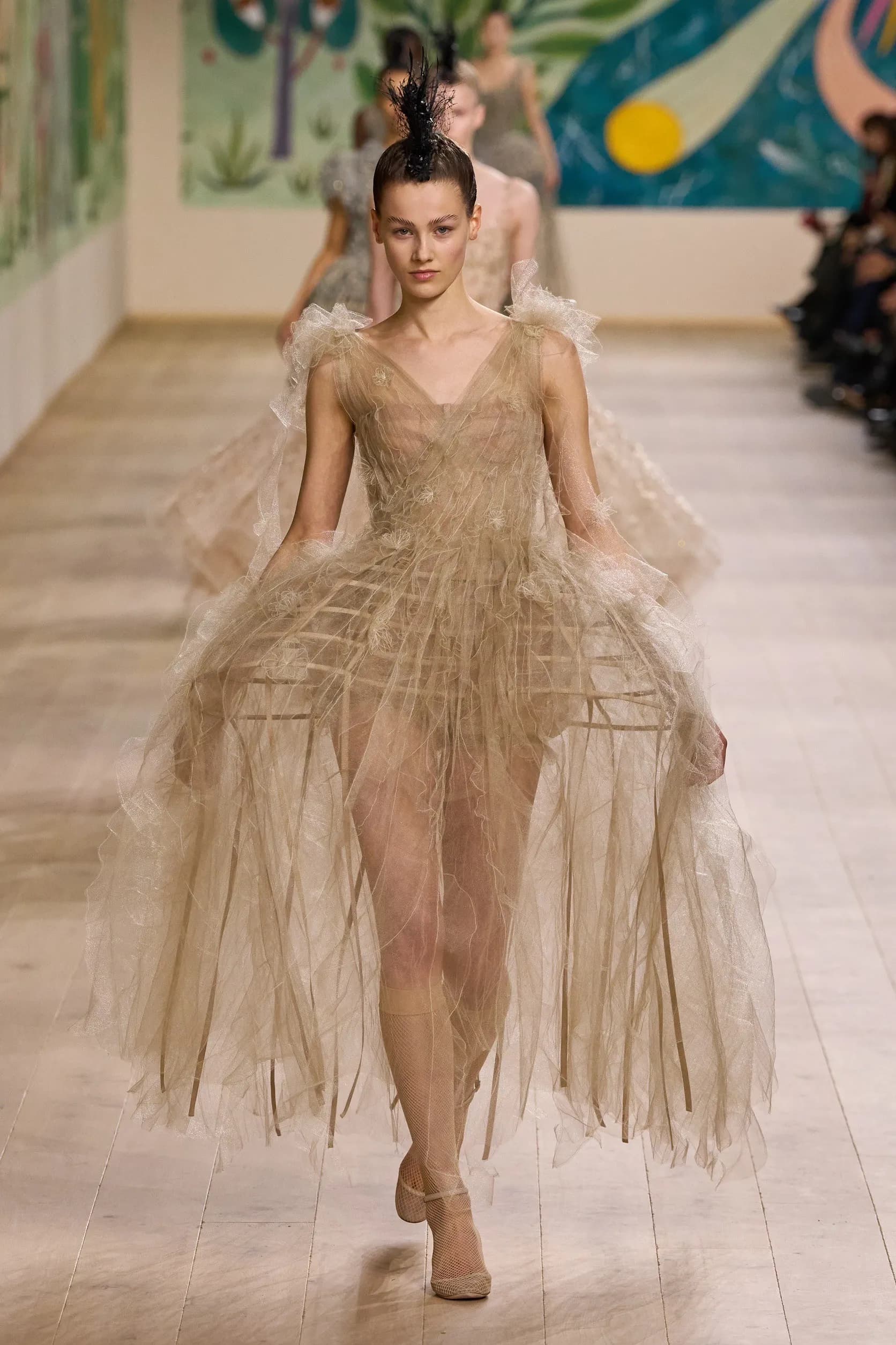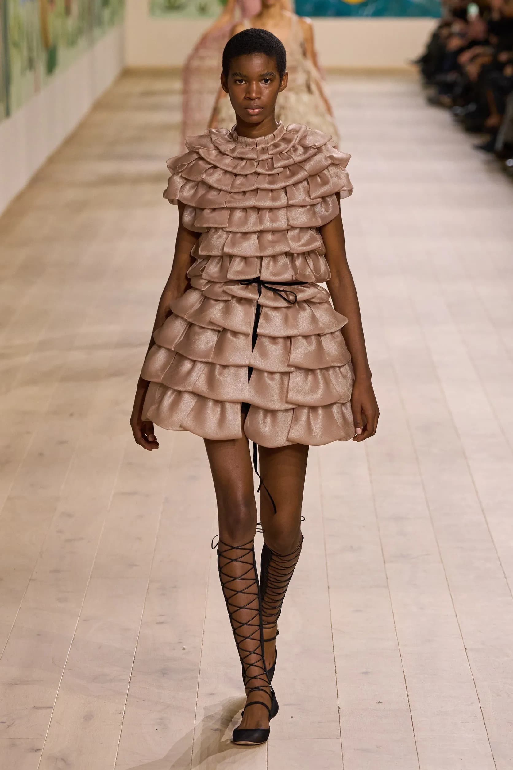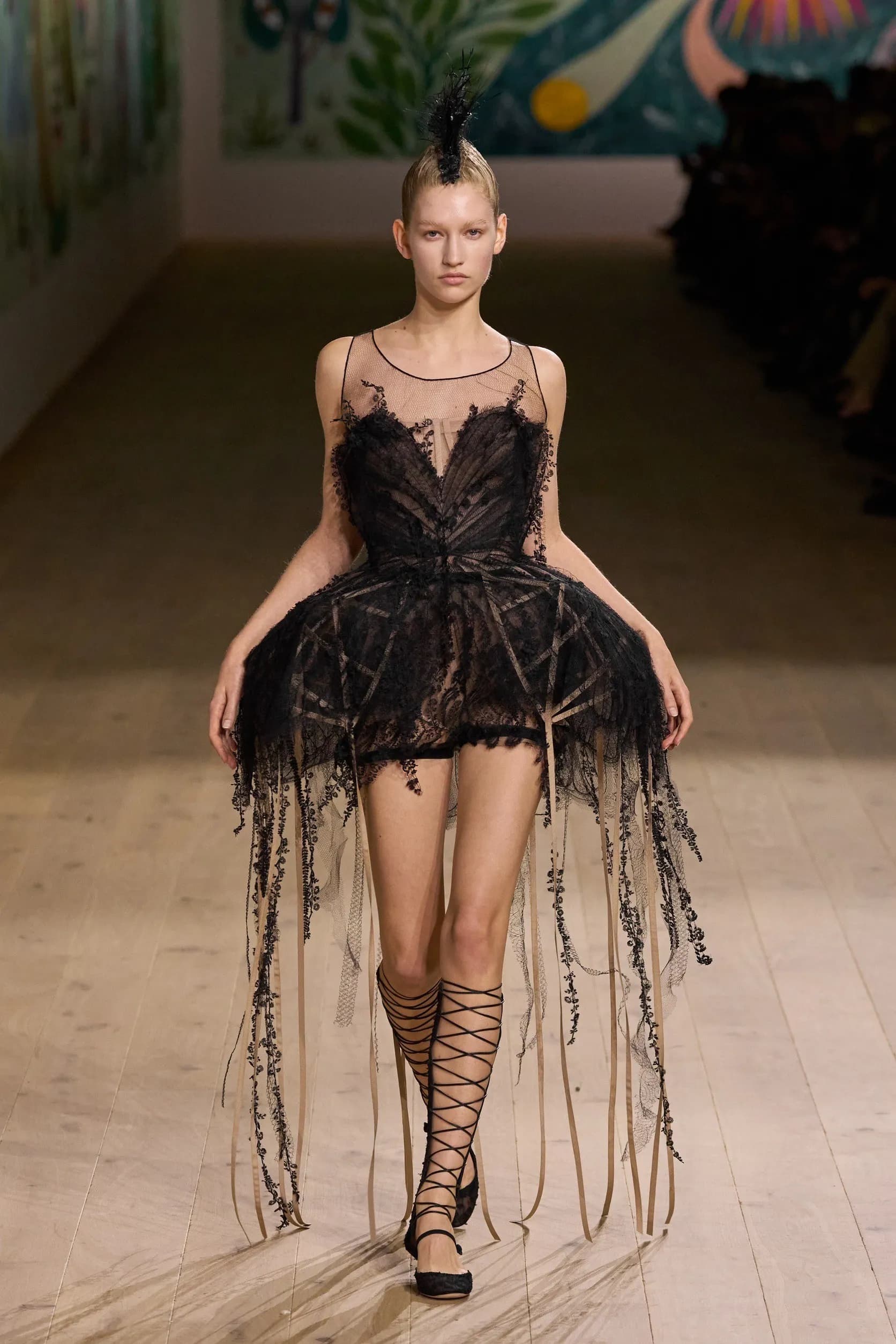 Trepèze Line กลายมาเป็นหัวใจหลักสำคัญ Dior ของคอลเล็กชั่นโอตกูตูร์ ฤดูใบไม้ผลิ/ฤดูร้อน 2025 พร้อมย้อนอดีตสู่ความเกรีียงไกรในยุคสมัยการกุมบังเหียนของ Yves Saint Laurent เมื่อช่วงปลายทศวรรษ 1950s ดูเหมือนว่า Maria Grazia Chiuri จะปรับโฉมรูปแบบของซิลูเอตให้เข้ากับยุคสมัยผ่านการเปลี่ยนแปลงสู่แพตเทิร์นเสื้อผ้าเด็ก โดดเด่นด้วยงานโครงสร้างชุดที่ถูกเปิดเปลือยให้เห็นชัดเจน เรื่อยไปจนถึงงานปักประดับฟลอรัลและลูกไม้พลิ้วไหว ที่ยังคงสะท้อนกลิ่นอายแบบเฟมินีนที่มาเรียถนัด นอกจากนี้การแบ่งสัดส่วน การครอป หรือแม้กระทั่งระดับความยาวของชุดยังเป็นไฮไลต์เด่นที่สะท้อนภาพความงดงามของผลงานตัดเย็บชั้นสูงครั้งนี้ ตัดกับเครื่องประดับศีรษะที่ให้กลิ่นอายความพังก์ผสมผสานความเนี้ยบสไตล์ซาร์ทอเรียล แนวทางแฟชั่น 2 รูปแบบที่สวนทางแต่บรรจบกัน ณ โชว์ครั้งนี้พอดิบพอดี คริโนลีน กระโปรงสุ่ม และกลิ่นอายของชุดสำหรับสตรียุคเก่าถูกรื้อสร้างใหม่ นำเสนอพร้อมกับผลงานการรังสรรค์ชิ้นไอคอนิกของ Christian Dior อย่างบาร์แจ็กเก็ต นอกจากนี้ยังมีมินิเดรสตัวจิ๋วที่สะท้อนภาพความงดงามของเมซงในการผลัดเปลี่ยนยุคสมัยได้เป็นอย่างดี ติดตามชมลุคทั้งหมดของโชว์นี้ได้ที่ด้านล่าง