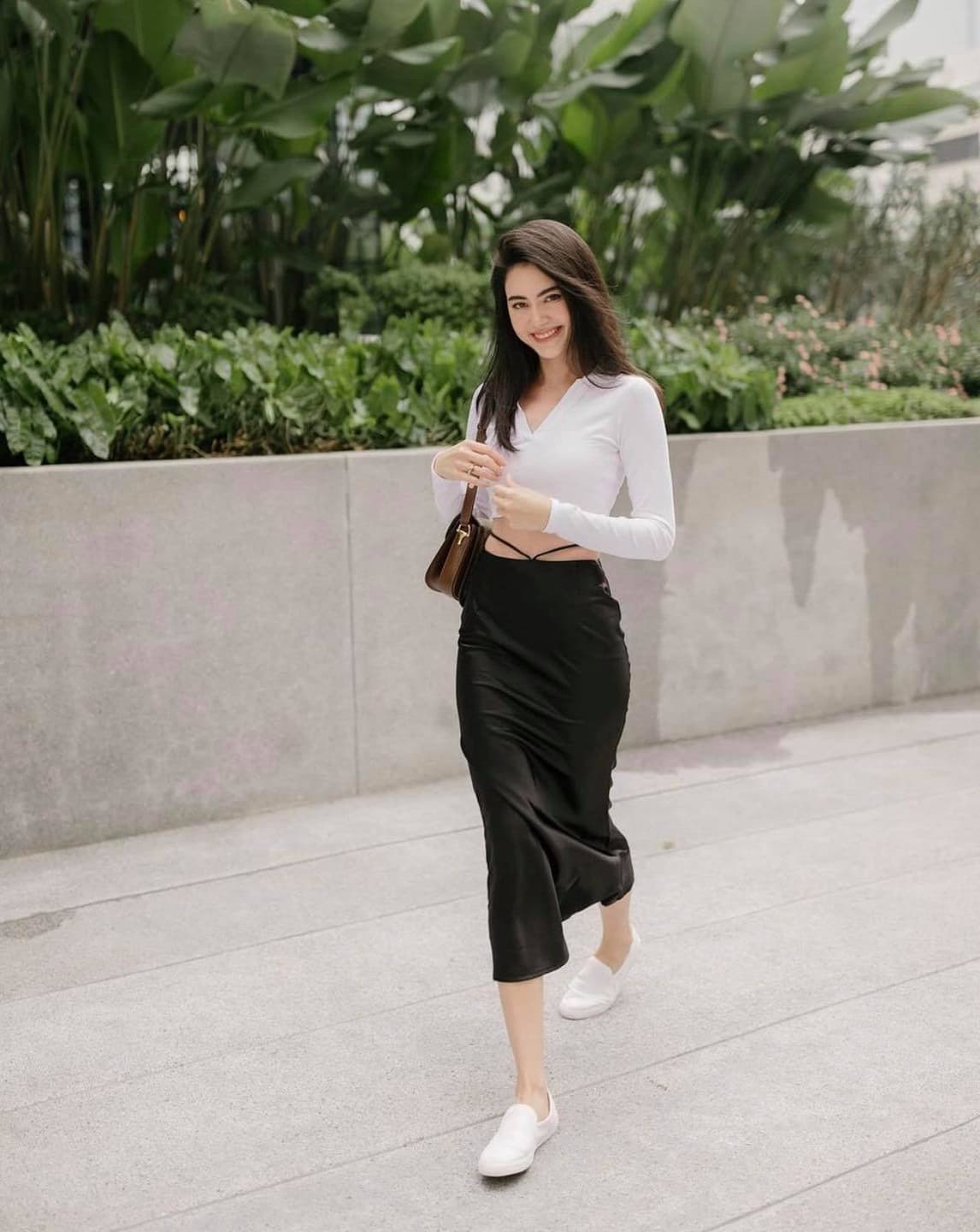 ถัดมาลุคที่ห้าเปลี่ยนจากกางเกงเป็นกระโปรงกันบ้าง ด้วยเสื้อครอปแขนยาวกับกระโปรงยาวทรงเอที่มีดีเทลเป็นสายรัดเอว เน้นให้เอวดูคอดและหุ่นเพรียวสวย