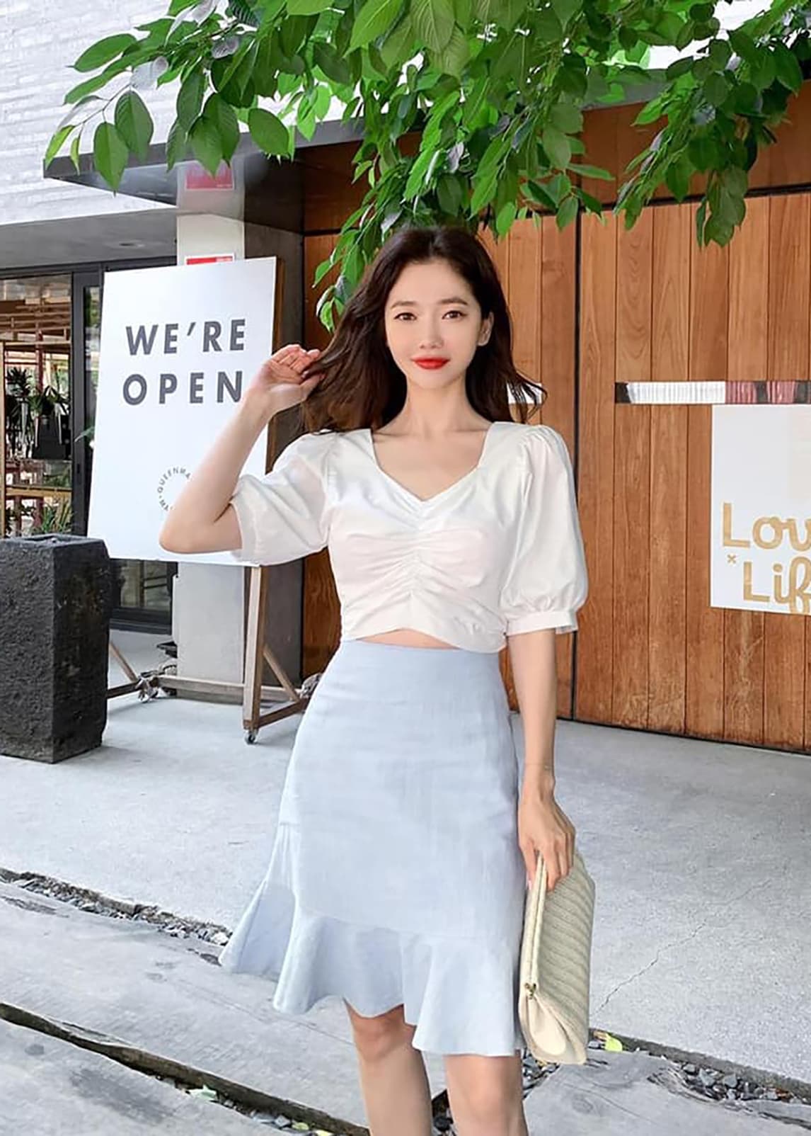 ลุคที่แปดมาในแนวหวานๆ ด้วยเสื้อครอปจับจีบด้านหน้า กับกระโปรงยาวปลายบานช่วงเข่า รังสรรค์เป็นลุคเก๋ที่สามารถแต่งไปทำงานได้เลย