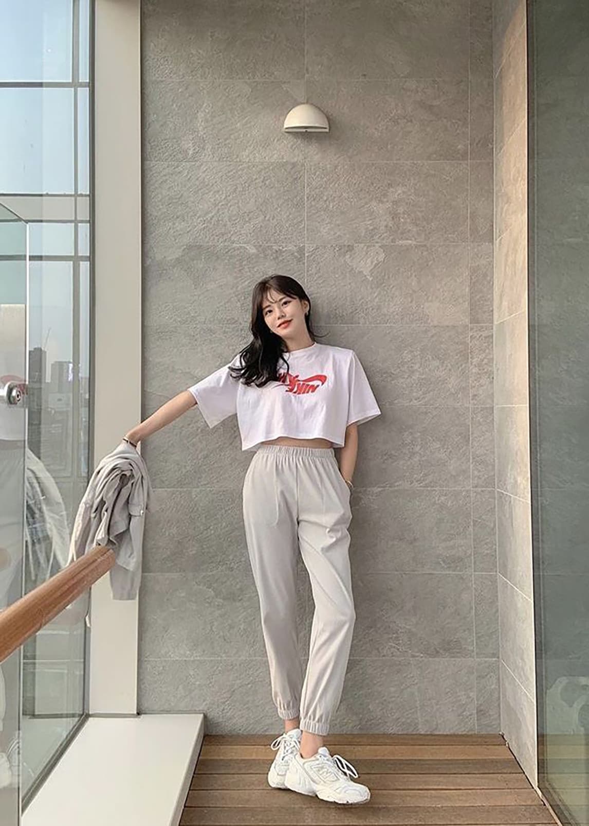 มาต่อกับลุคที่หกเหมาะสำหรับวันสบายๆ ด้วยเสื้อยืดครอปโอเวอร์ไซซ์สไตลิ่งเข้ากับกางเกงวอร์มขาจั๊มป์ แมตช์กับสนีกเกอร์ทรงชังกี้ ได้ลุคสตรีตสไตล์โคเรียนเกิร์ล