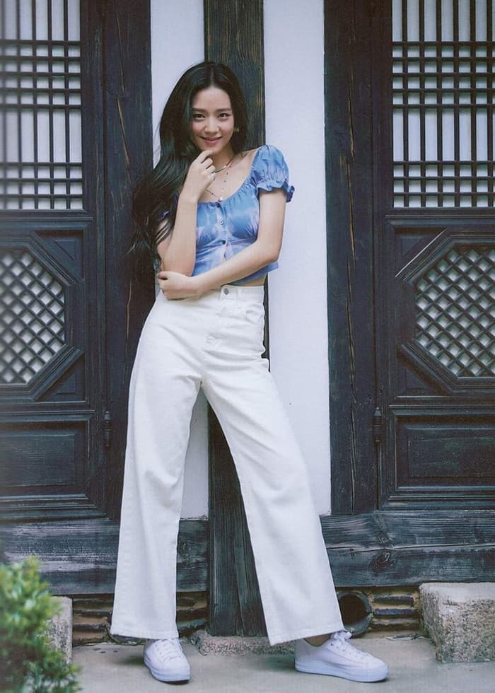 เปิดด้วยลุคแรกที่แมตช์กางเกงยีนส์ทรงกระบอกสีขาวกับเสื้อครอปเอวลอยแขนตุ๊กตา พร้อมสวมรองเท้าผ้าใบสีขาวสไตล์มินิมัล ได้เป็น Everyday Look ที่น่ารักสดใส มองยังไงก็ไม่น่าเบื่อ