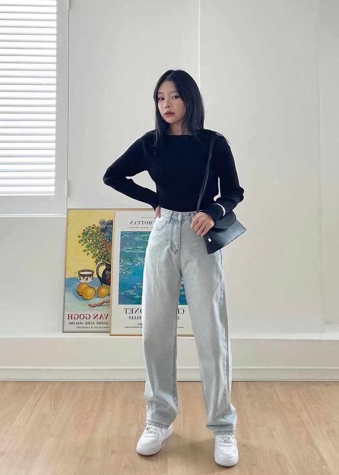 สุดท้ายจบด้วยลุคสำหรับวันสบายๆ ที่ไม่อยากแต่งตัวเยอะจนเกินไปด้วยการแมตช์เสื้อยืดสีดำแขนยาวคอปาดกับกางเกงยีนส์ทรงกระบอก เป็นลุคที่เหมาะมากสำหรับสาวอวบ เพราะทั้งเสื้อและกางเกงช่วยพรางหุ่นให้เพรียวราวกับเสกได้
