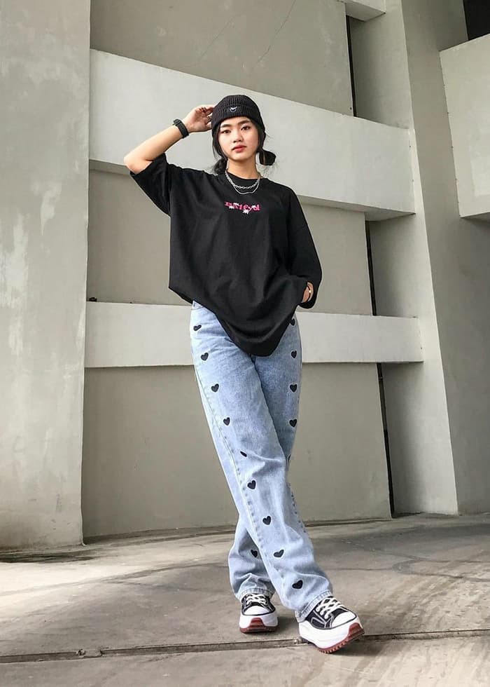 ลุคที่สี่นี้เอาใจสาวเท่ด้วยการแมตช์เสื้อยืดโอเวอร์ไซซ์กับกางเกงยีนส์ทรงกระบอกที่แต่งดีเทลงานปักรูปหัวใจน่ารักๆ พร้อมใส่รองเท้าผ้าใบส้นหนาเพิ่มความสูงหรือจะใส่กับสนีกเกอร์ทรงชังกี้ก็ดูเข้ากัน