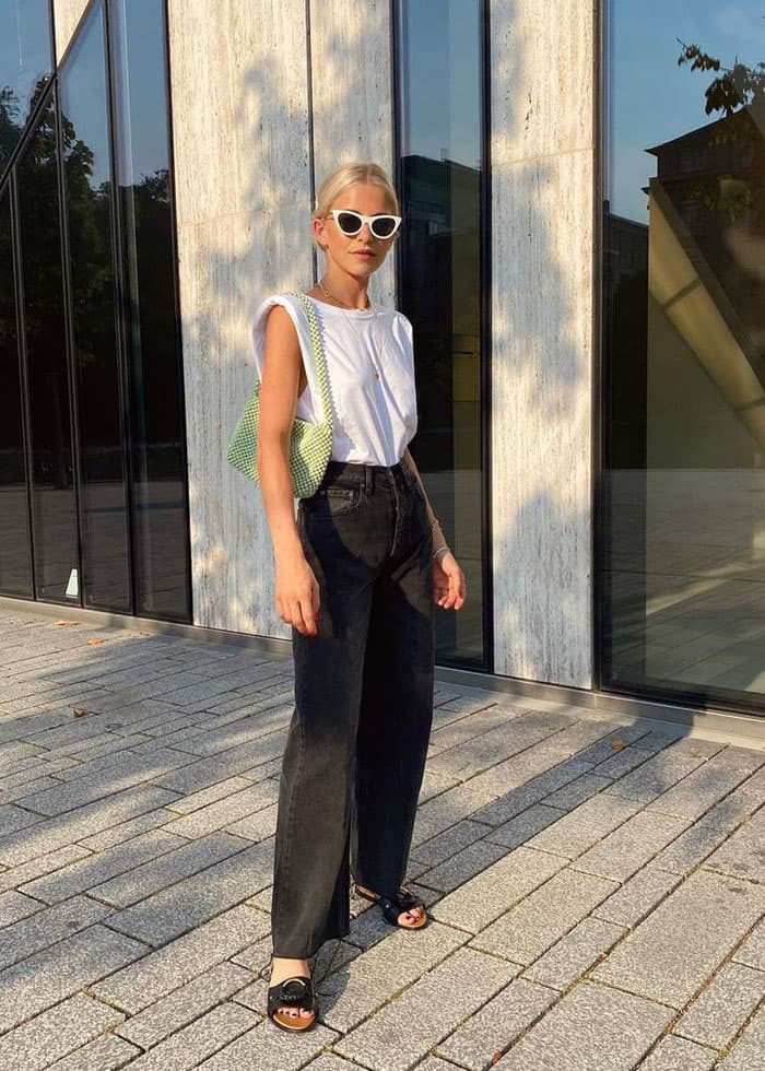 ลุคที่เจ็ดสำหรับการแต่งกายแบบง่ายๆ คงหนีไม่พ้นการแมตช์กางเกงยีนส์ขากระบอกกับเสื้อยืด แต่ถ้าจำเจกับเสื้อยืดธรรมดาแล้ว ลองเปลี่ยนมาเป็นเสื้อยืดไหล่ตั้งแบบนี้ก็ดูดีไปอีกแบบ