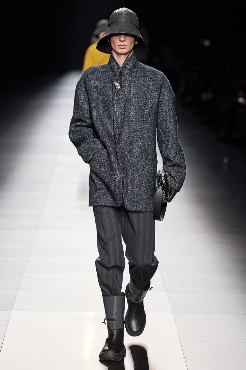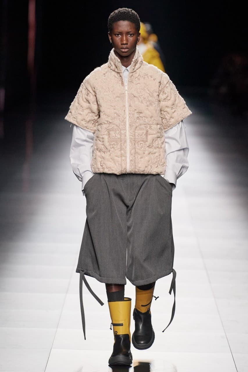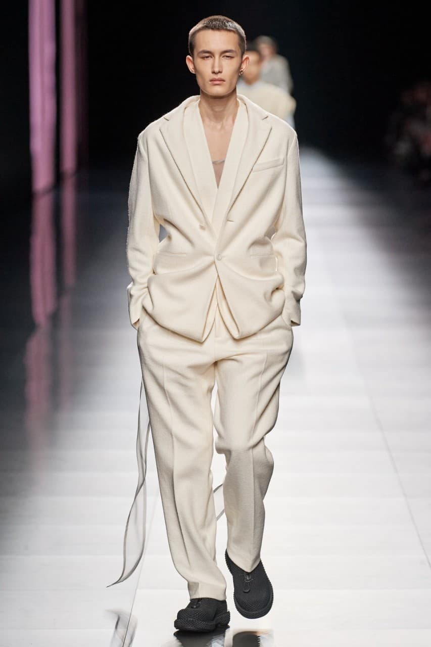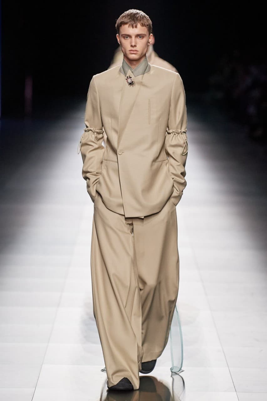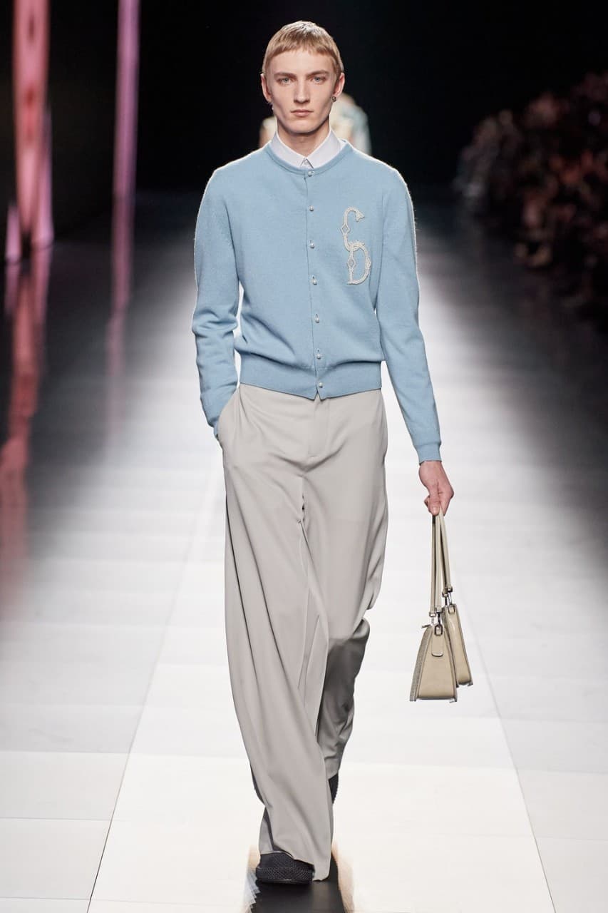 คิม โจนส์ สร้างสรรค์คอลเล็กชั่นเสื้อผ้าผู้ชายลำดับล่าสุด ด้วยการหันกลับไปฉกฉวยเอาแรงบันดาลใจจากผลงานของ อีฟ แซงต์ โลรองต์ ดีไซเนอร์ที่เคยแวะเวียนมากุมบังเหียนดิออร์ในช่วงปี 1958-1960 กลับมารังสรรค์ใหม่ สะท้อนกลิ่นอายงานตัดเย็บสุดประณีตระดับกูตูร์ ที่เห็นได้ชัดจากเทคนิคงานเทเลอริ่งเสื้อแจ็กเก็ตปราศจากฟองน้ำหนุนไหล่ เพื่อสร้างซิลูเอตแสนละมุน, งานปักประดับโมทีฟละเอียดยิบ เรื่อยไปจนถึงการเลเยอร์วัสดุต่างชนิดในโททัลลุคเดียว อีกทั้งยังคงดีเอ็นเองานออกแบบของคิมเอาไว้นั่นคือความเฟมินีน ที่กระจายอยู่ทั่วทั้งบนเสื้อผ้า อย่างกางเกงขาสั้นตัดเย็บคล้ายกระโปรงและแอ็กเซสเซอรี่กระเป๋าหนังขนาดเล็กในซีซั่นนี้